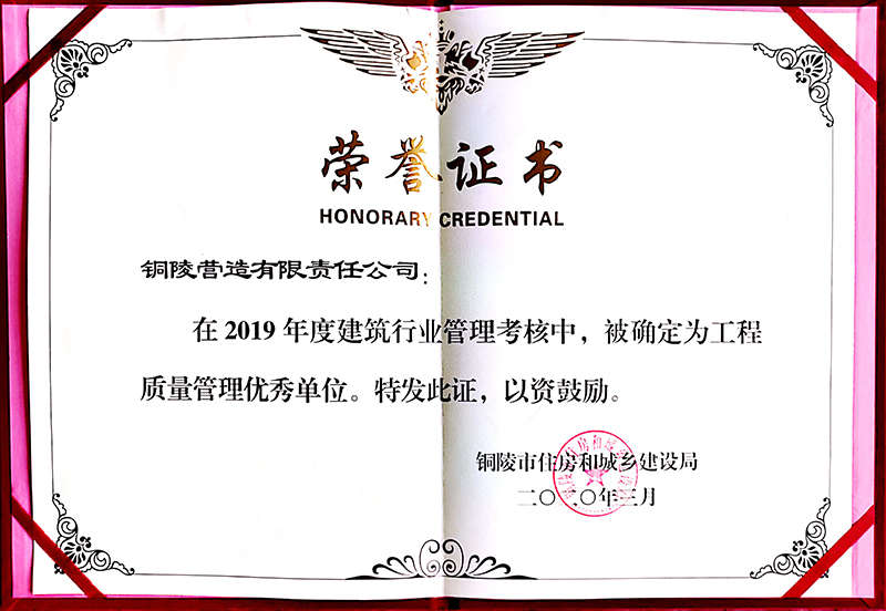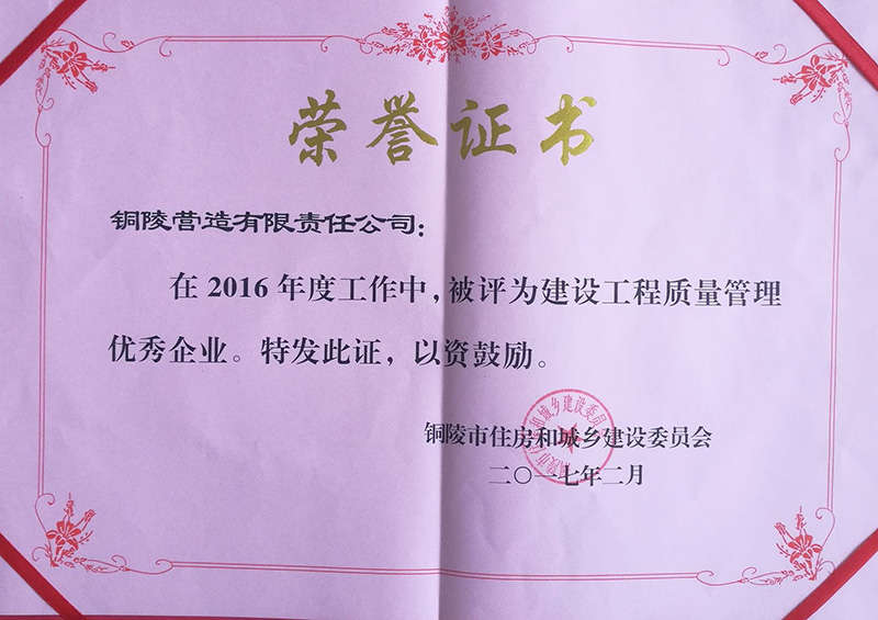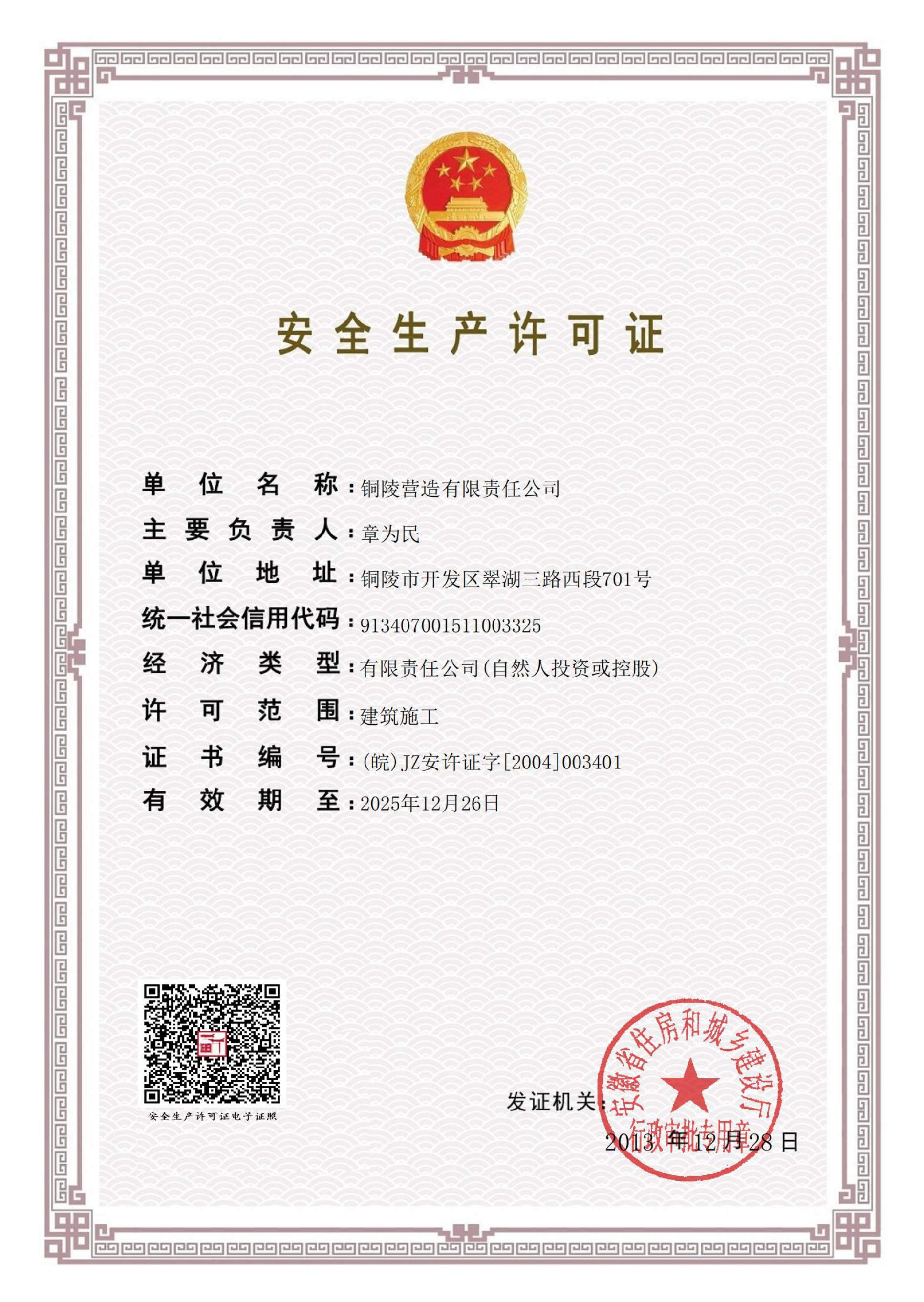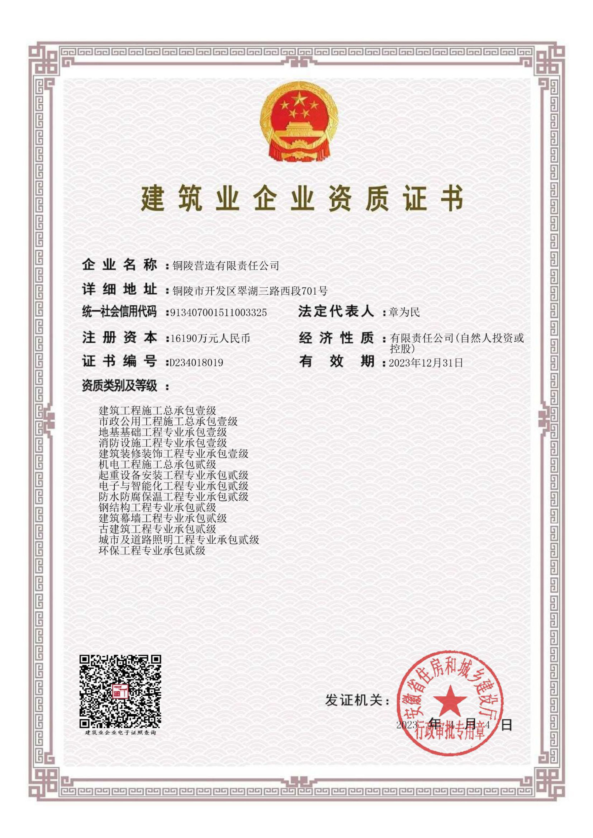 銅陵?duì)I造有限責(zé)任公司是國家住建部核準(zhǔn)的房屋建筑總承包一級(jí)企業(yè)。2006年7月,企業(yè)二次改制為民營企業(yè),并更名為“銅陵?duì)I造有限責(zé)任公司”。目前,公司擁有房建施工總承包、市政公用工程總承包、鋼結(jié)構(gòu)專業(yè)工程承包、建筑裝修裝飾專業(yè)工程承包四項(xiàng)壹級(jí)資質(zhì),機(jī)電安裝、起重設(shè)備安裝、建筑幕墻三項(xiàng)貳級(jí)資質(zhì),地基與基礎(chǔ)一項(xiàng)叁級(jí)資質(zhì)。2008年通過北京恩格威ISO9001、ISO14001和OHSAS18001“三合一”體系認(rèn)證。